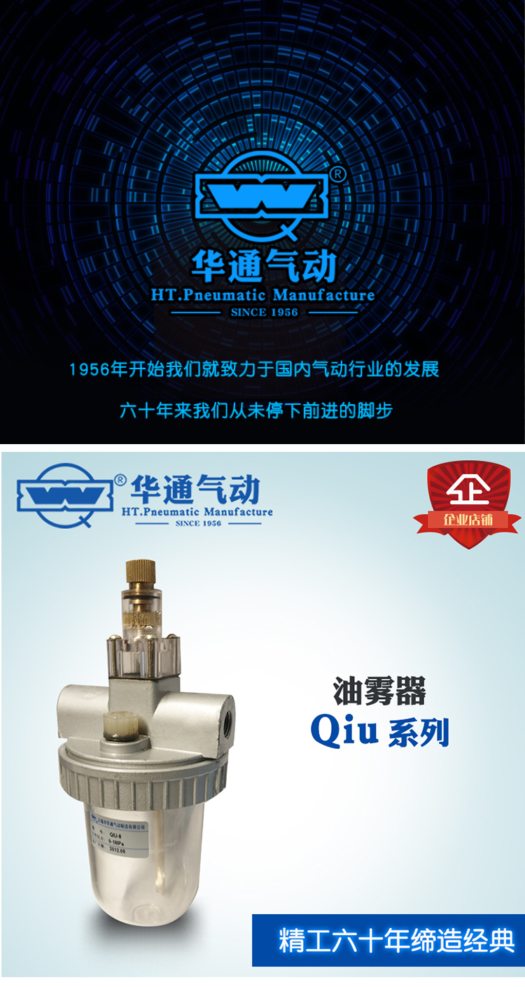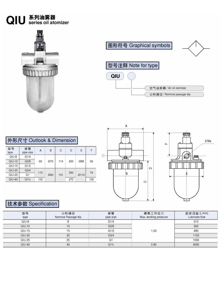 油雾器QIU系列 技术参数 型号公称通径(mm)接管最高工作压力(MPa)过滤度*(L/min)QIU-88G1/41.00210 QIU-1010G3/8300QIU-1515G1/2480QIU-2020G3/41160QIU-2525G11600QIU-4040G11/20.804000 #工作压力0.63MPa,滴油量 5 滴/min,润滑油运动粘