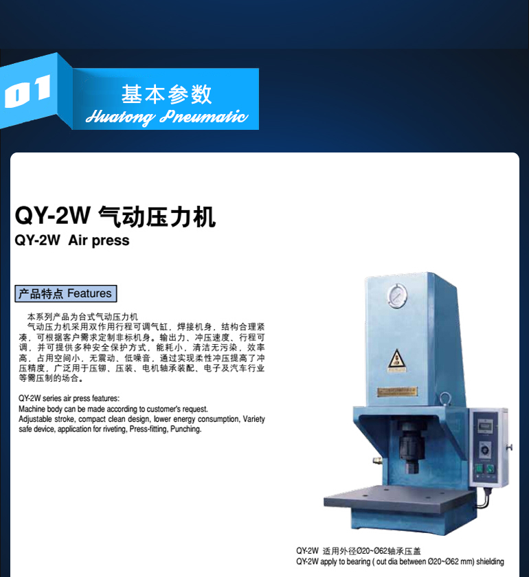 气动压力机/气动冲床采用双作用行程可调气缸,焊接机身,结构合理紧凑,可根据客户需求定制非标机身。输出力、冲压速度、行程可调,并可提供多种安全保护方式,能耗小,清洁无污染,效率高,占用空间小,无震动、低噪音,通过实现柔性冲压提高了冲压精度,广泛用于压铆、压装、电机轴承装配、电子及汽车行业等需压制的场合。