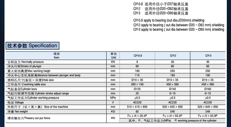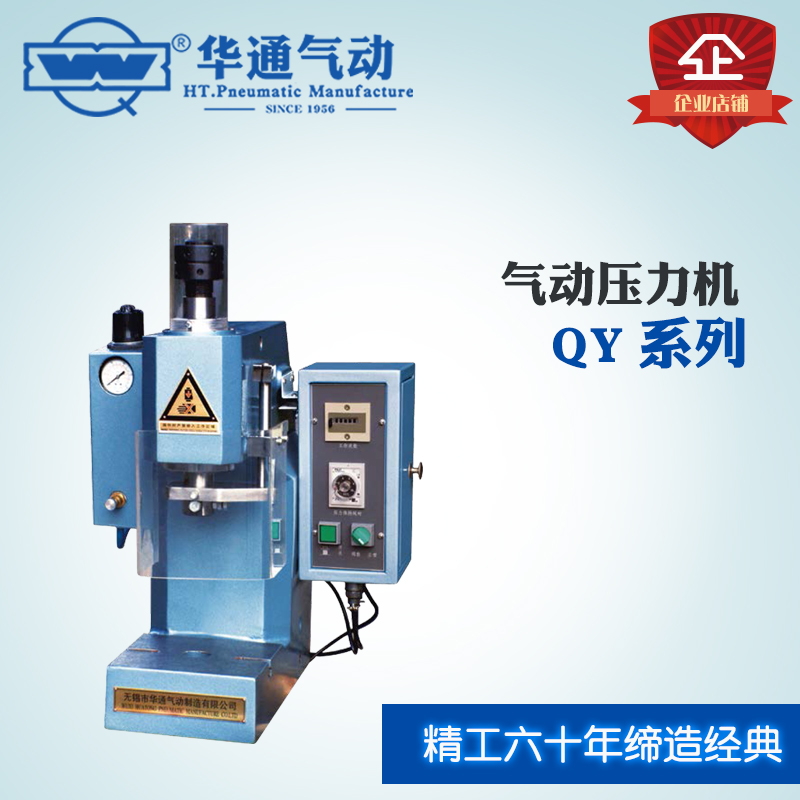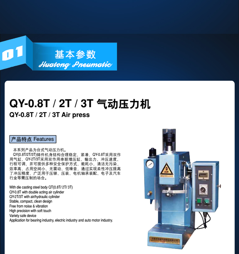QY(0.8T/2T/3T)铸件机身结构合理稳定、紧凑,QY-0.8T采用双作用气缸,QY-2T/3T采用双作用串联增压缸,输出力、冲压速度、行程可调,并可提供多种安全保护方式,能耗小,清洁无污染,效率高,占用空间小,无震动、低噪音,通过实现柔性冲压提高了冲压精度,广泛用于压铆、压装、电机轴承装配、电子及汽车行业等需压制的场合。