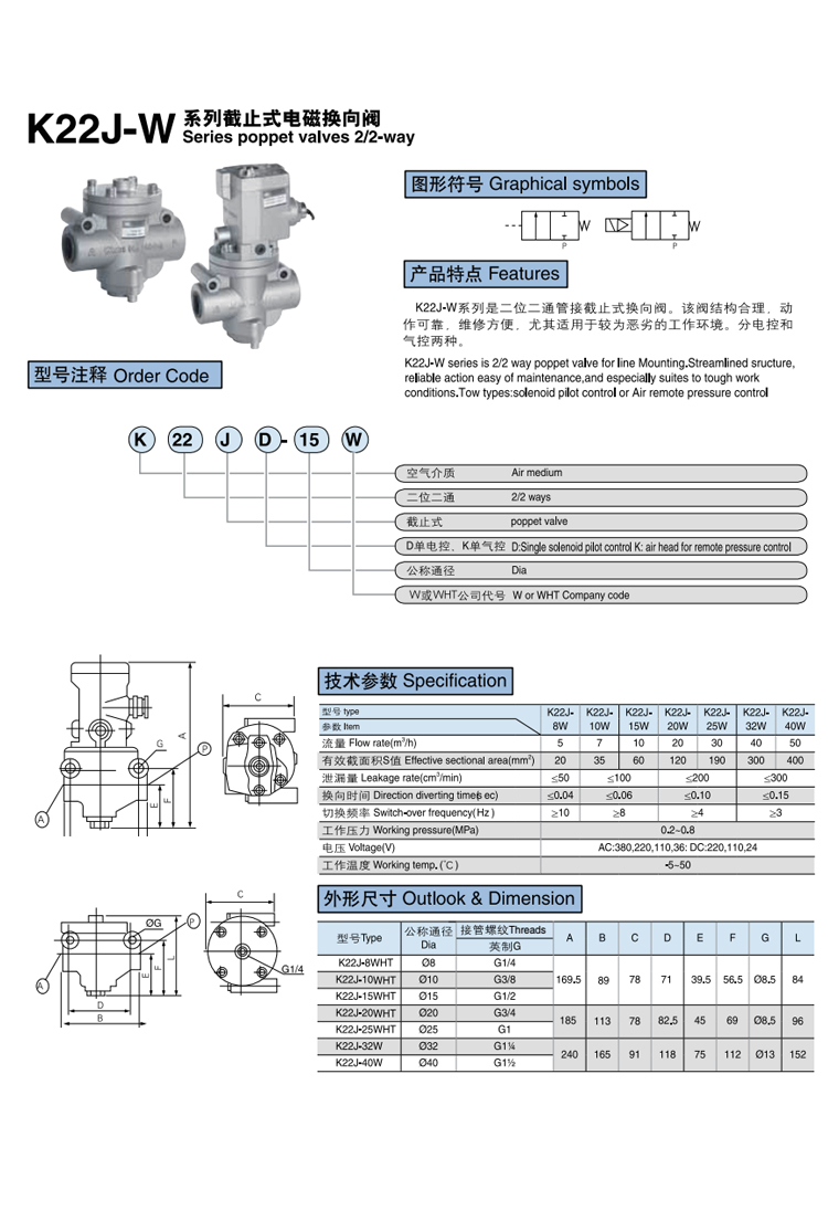 K22J-W系列 截止式电磁阀 产品特点 K22J-W系列是二位二通管接截止式换向阀。该阀结构合理,动作可靠,维修方便,尤其适用于较为恶劣的工作环境。分电控和气控两种。