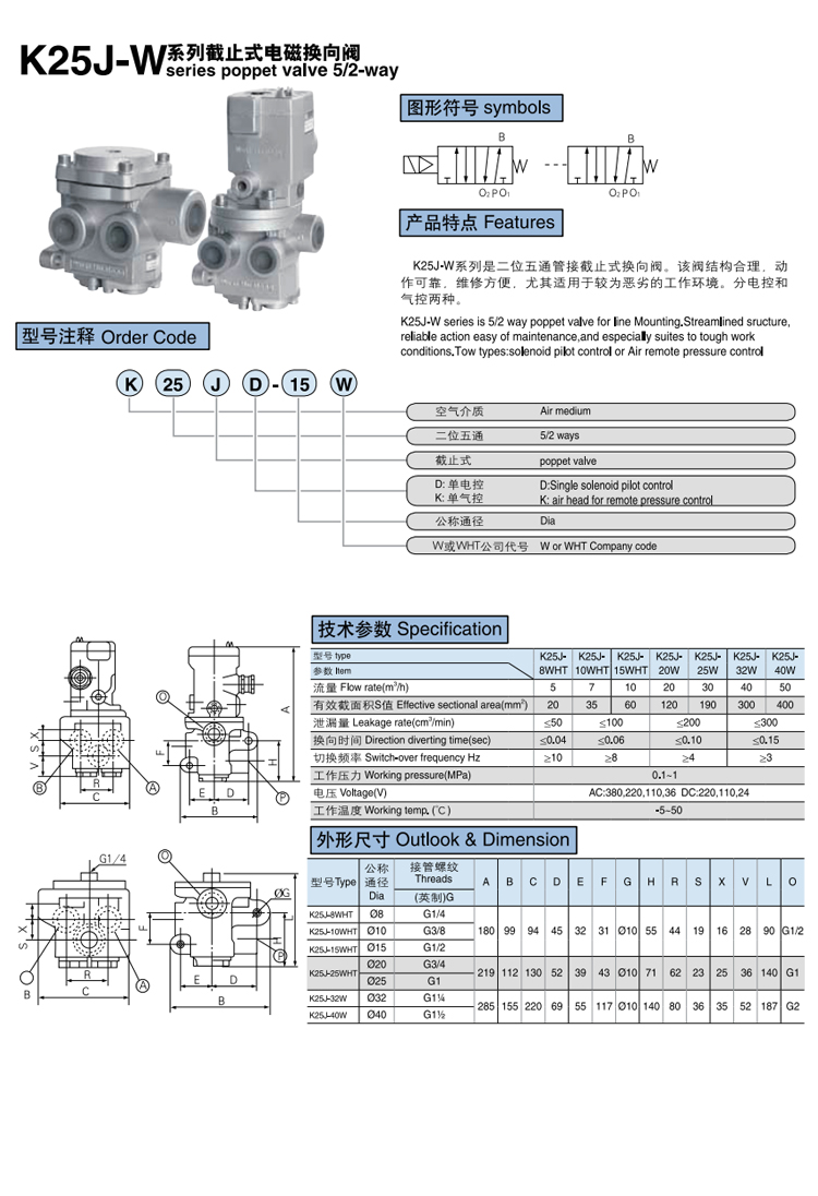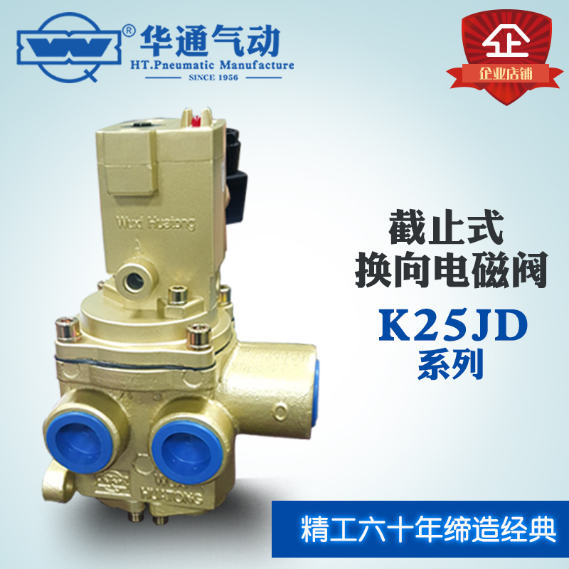 K25J-W系列 二位五通管接截止式换向电磁阀 产品特点 K25J-W系列是二位五通管接截止式换向阀。该阀结构合理,动作可靠,维修方便,尤其适用于较为恶劣的工作环境。分电控和气控两种。